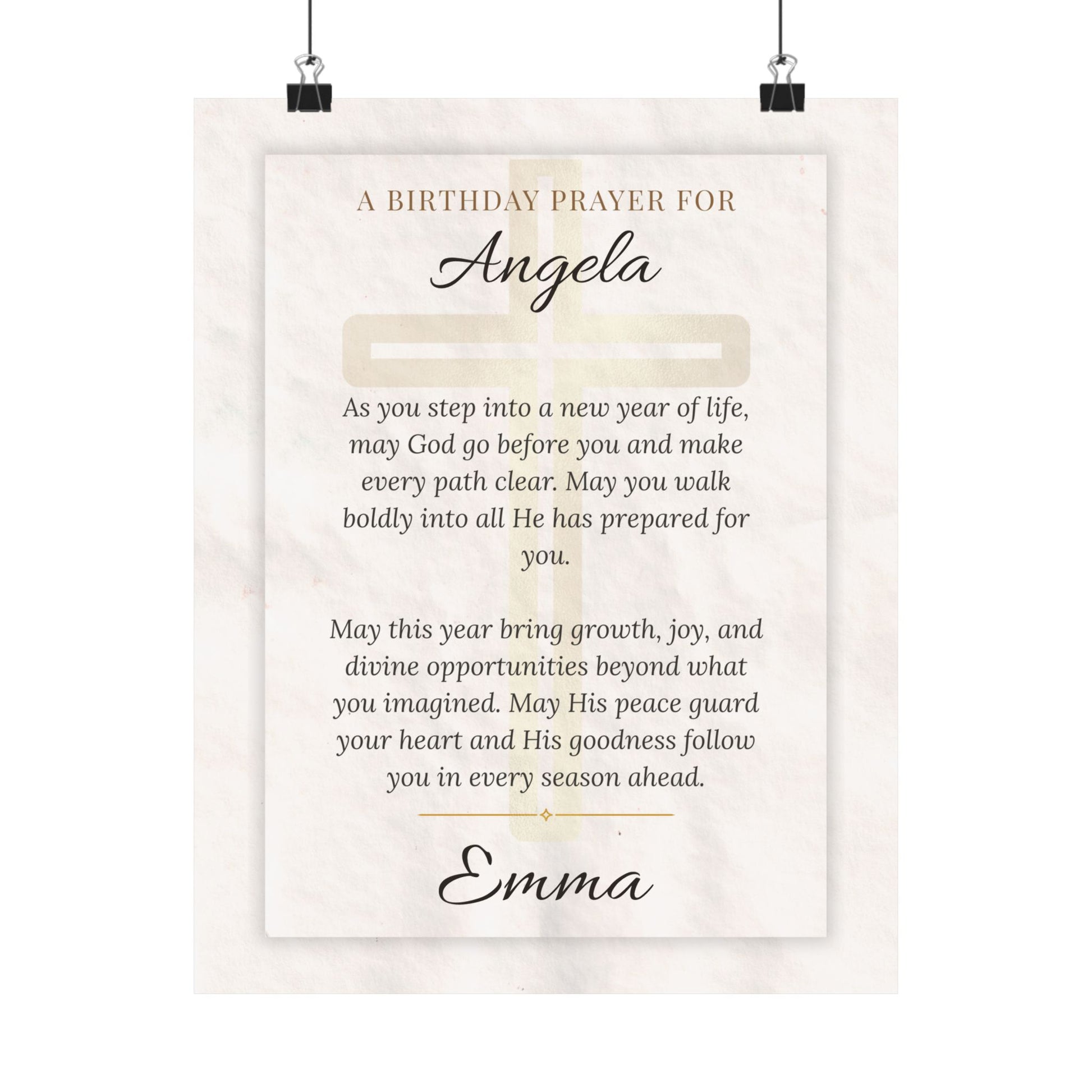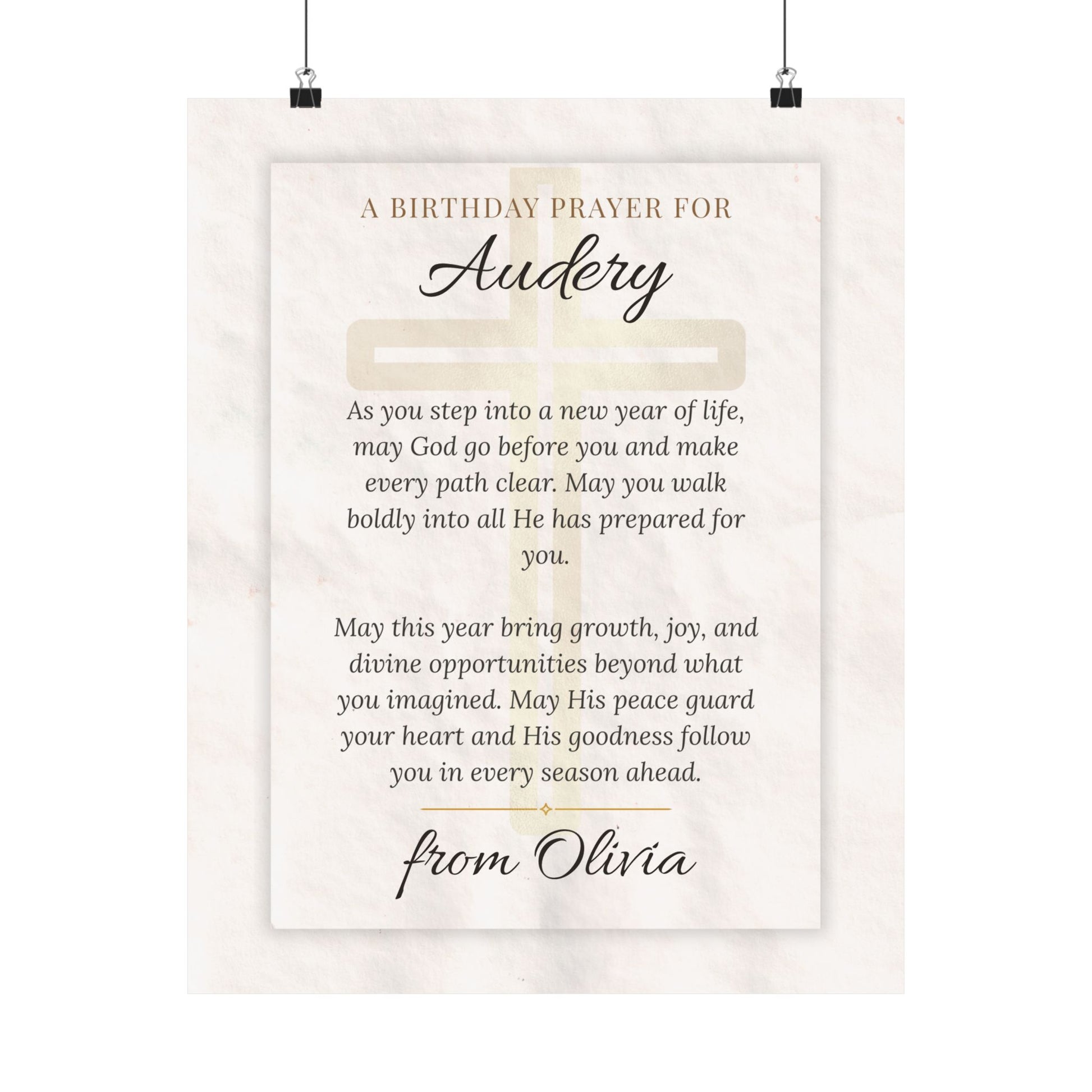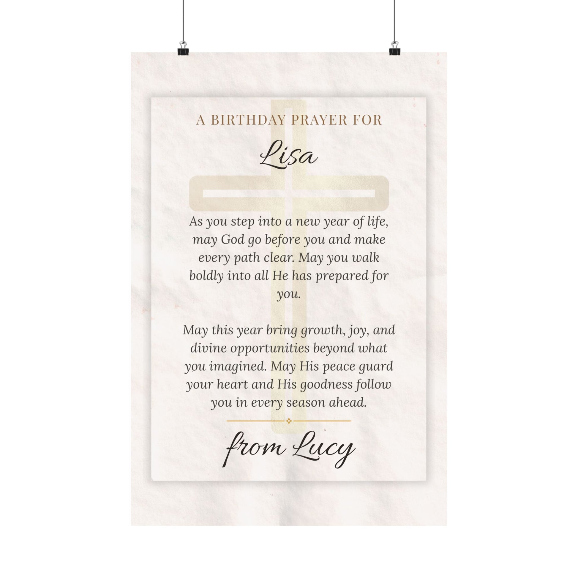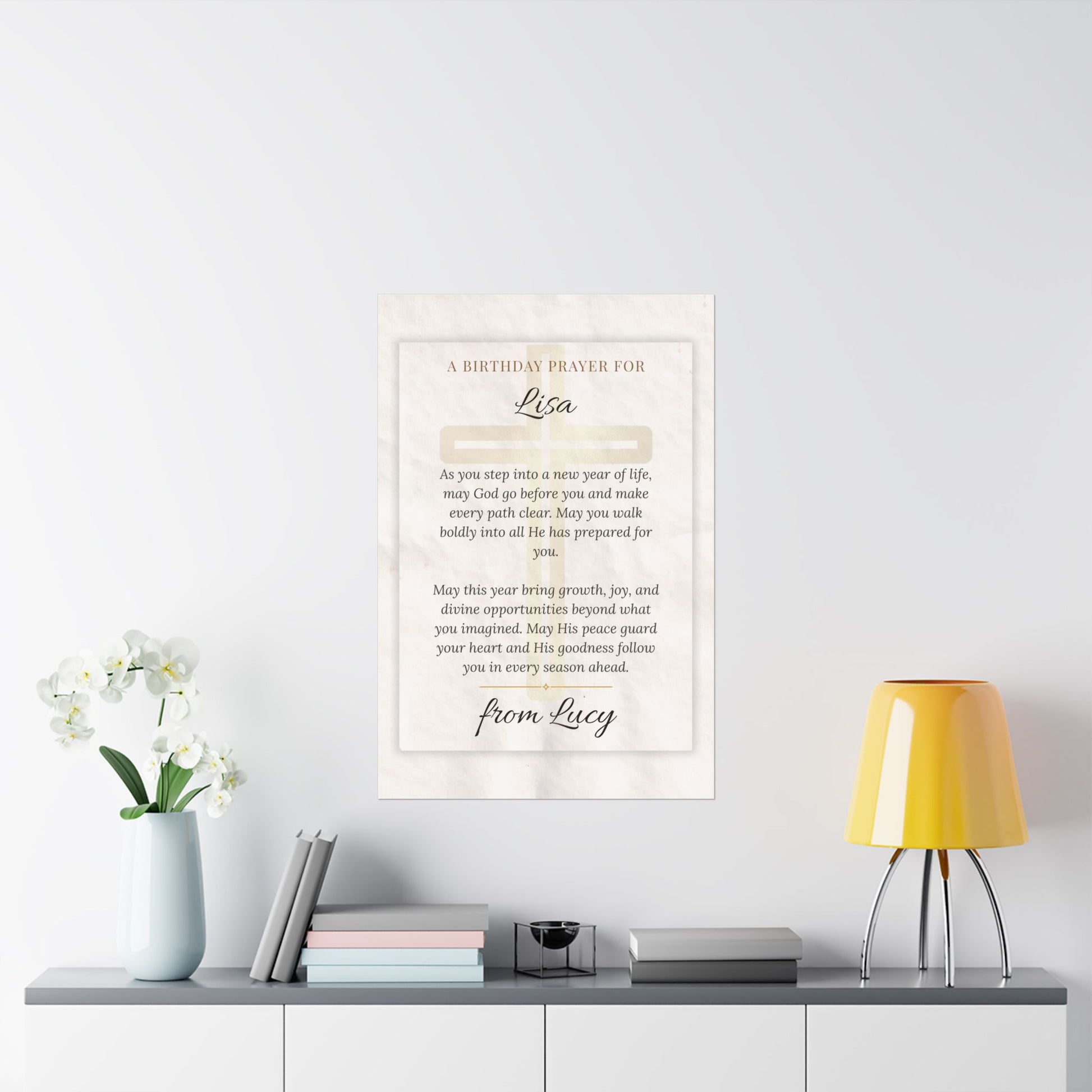 A soft, satin-finish poster printed on archival museum-grade paper, this piece frames a gentle birthday prayer in elegant script. The warm, low-glare surface and finely detailed pigment inks let the creamy, textured background and delicate typography breathe — like a handwritten blessing turned into art. It hangs easily in living rooms, bedrooms, or quiet corners where faith and reflection belong, bringing a calm, reverent presence to the room. Size and orientation are flexible to suit bedside walls or gallery arrangements; the durable, color-stable print keeps that heartfelt message looking fresh for years.